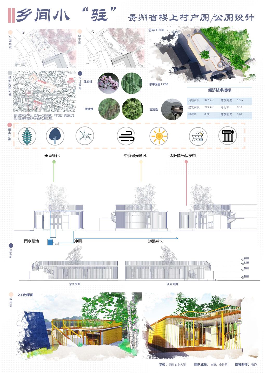 调研结束后,团队成员马不停蹄地进行数据整理,情况归纳以及基础图纸模型的绘制,总结出室内一体式、室内隔断式、室外独立式3种户厕类型,并对应到具体农户进行改造设计。结合村落空间节点和居民实际需求,团队成员选定了一处位于村落主要交通节点的室外独立式厕所,意在改造成一所与当地建筑风貌相融合,结合休憩庭院、观景平台,传递新型的厕所观念与当地文化宣传,采用当地传统建筑材料进行创新应用,造价适宜、节约能源,同时兼顾不同对象使用的综合性厕所。设计作品历经三个月的不断修改完善,获得此次竞赛专家评委的肯定。