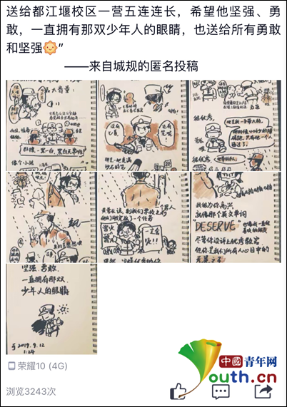 在该校军训期间,四川内江发生了5.4级地震,梁舒彤表示,看到新闻报道中前去救援的官兵,觉得自己很有幸能与武警战士们朝夕相处十多天,便根据日常训练为自己连的教官创作了一组漫画,也为同营的其他连长制作了专属明信片。