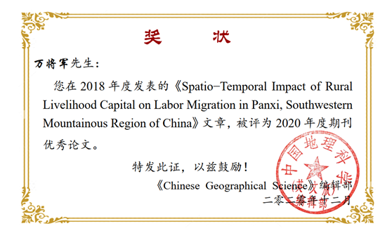 91UBER青年教师万将军博士在2018年发表的题为《Spatial-Temporal Impact of Rural Livelihood Capitals on Labor , Migration in Panxi, Southwestern Mountainous Region of China》的文章,经过两年的持续传播,产生了较大的社会影响力,于近日被《中国地理科学》(英文版)评为2020年度优秀论文。