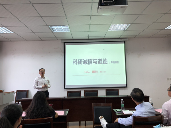 院长曹云忠做了《科研诚信与道德》专题报告,指出作为学术研究人应该秉持科学、严谨、诚信态度,通过举出实际案例,系统阐述了如何避免数据处理、论文撰写、文献引用、论文发表以及学术履历等方面的诚信问题。