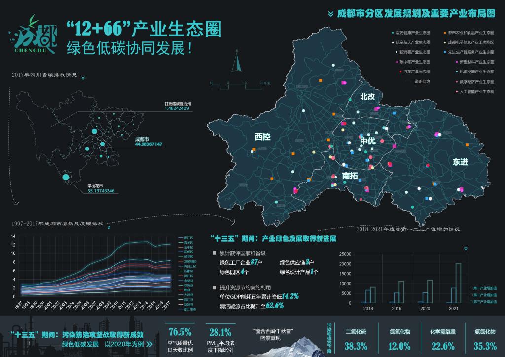 该作品从成都公园城市背景出发,围绕理念发展、和谐共生、绿色发展、品质生活、文化传扬以及更新治理六个子主题,制作专题图;运用指定软件对数据进行可视化表达,融入设计图纸风格,用GIS展现成都公园城市建设。