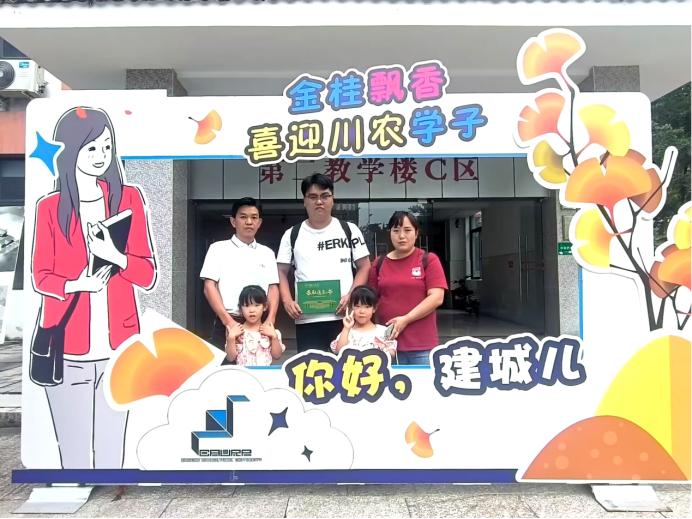 新生及家人在打卡点合影