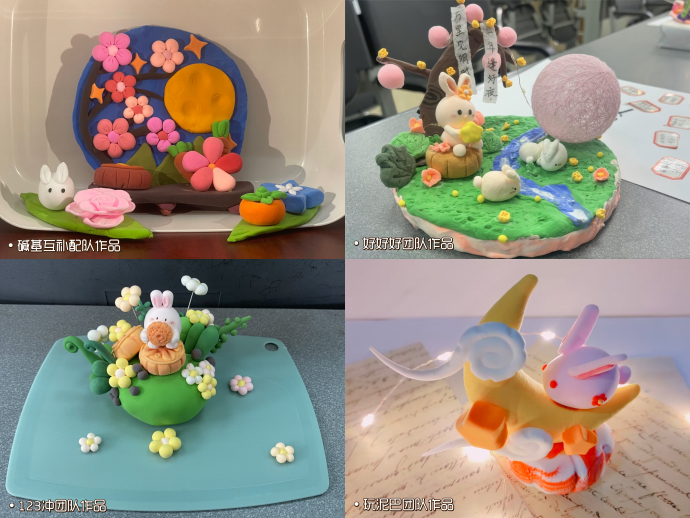 此外,有的团队制作了精美的中秋花篮,有的团队创作了栩栩如生的玉兔,有的团队制作了带有校徽的月饼。每个团队的创意精彩绝伦,作品的装饰玲珑精致,通过手工作品把相思托付给玉兔,把团圆寄予明月,在此刻共享中秋的独特韵味,分享彼此心目中的中秋。