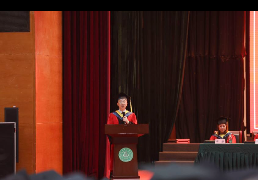 黄领披肩,蓝袍加身,研究生优秀标兵获得者、土木水利专业武文静同学代表研究生毕业生发言。她表达了对母校的感激,回忆了在校奋斗的青葱岁月,更流露出深深的川农情。最后,她号召同学们在毕业之际,将对学校的不舍与留恋化作未来砥砺前行的动力,在川农大精神的引领下,在强国建设新征程中展现新时代好青年的川农风采。