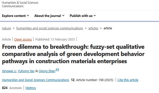 (论文原文链接:Li, X., Yao, Y. & Shen, Q. (2025). From dilemma to breakthrough: fuzzy-set qualitative comparative analysis of green development behavior pathways in construction materials enterprises. Humanities and Social Sciences Communications. 12(1): 198. )