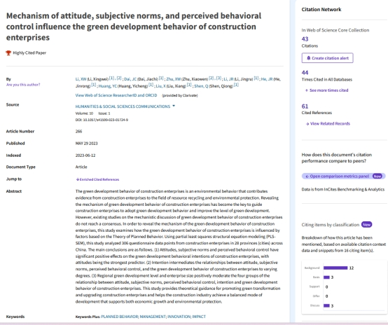 (论文原文链接:Li, X., Dai, J., Zhu, X., Li, J., He, J., Huang, Y., Liu, X. & Shen, Q. (2023). Mechanism of attitude, subjective norms, and perceived behavioral control influence the green development behavior of construction enterprises. Humanities and Social Sciences Communications, 10(1), 266.