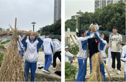 活动现场,党员分组带领中学生完成从骨架搭建、稻草填充到角色装饰的全过程,实现理论教育与实践锻炼的有机统一。党员充分发挥先锋模范作用,提前到场备料保障物资供应,全程巡查安全排查隐患,同时结合培训攻克造型难点并示范。党员们的担当作为确保了活动的规范高效,中学生在协作中不仅提升了动手与团队协作能力,更被党员的担当精神所感染,进一步加深对中华优秀传统文化与劳动精神的理解。