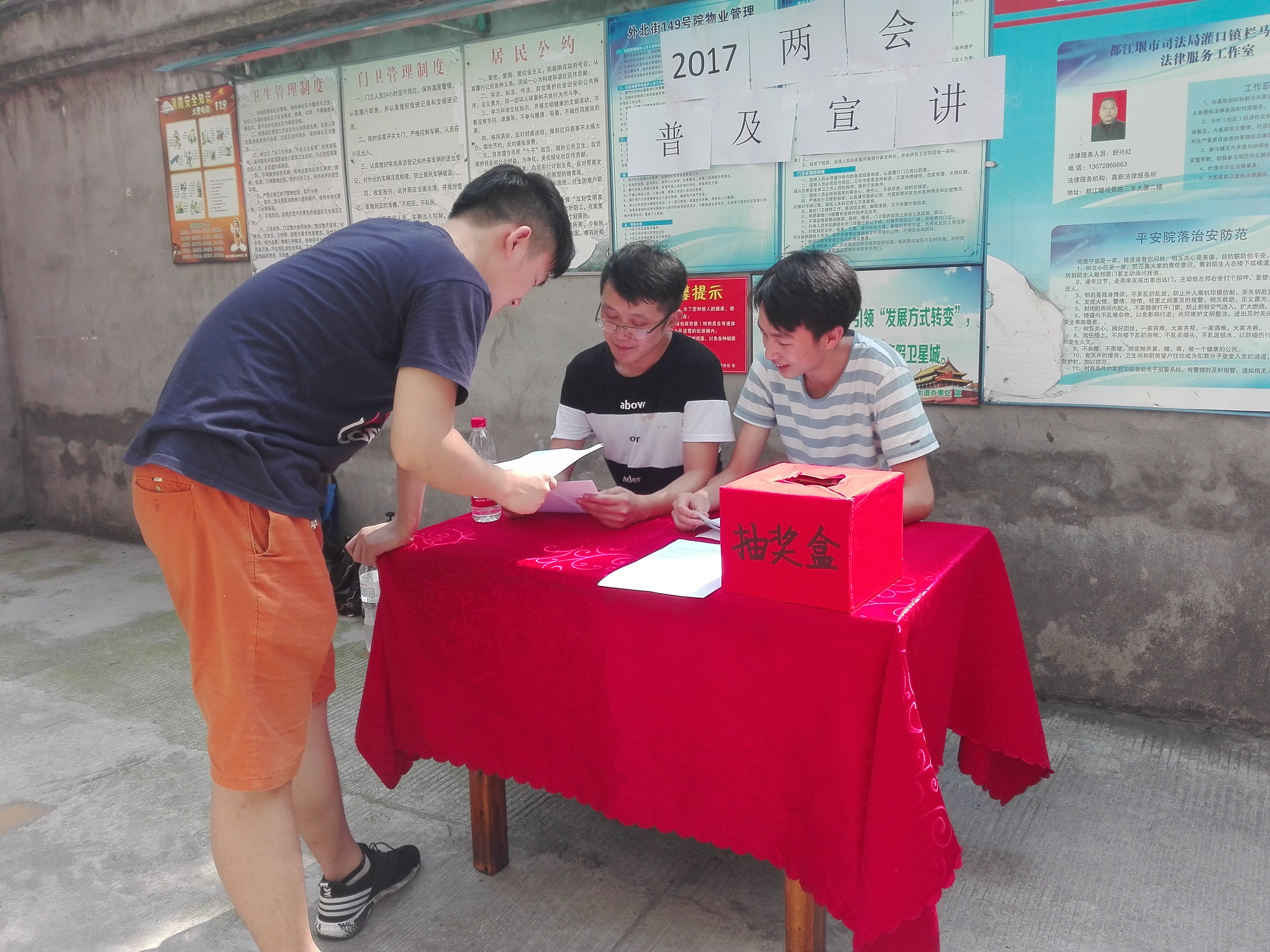 2017年7月9日,“人民公仆”团队在都江堰栏马桥社区进行了“两会”相关内容普及宣讲以及抽奖活动,同时在网上发放线上问卷,并在下午到街子古镇及西街进行了线下的问卷调查。