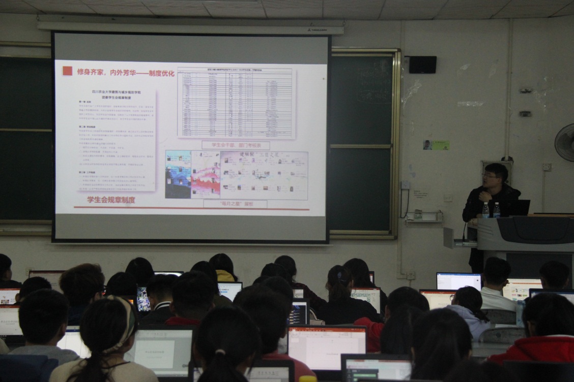 当日,教学楼前银杏飞舞,大家携电脑陆续走进培训教室。现场座位已经提前安排好,培训活动有序的开展。在主持人简略的介绍后,林志逸运用教室里的电子白板和教学工具开始了培训。他以自己扎实的电脑操作技能和相关知识,向大家展示了常用的Word、Excel和ppt的基本操作方法。并把自己通过不断使用办公软件总结得来的小技巧倾囊相授。这位细心而耐心的主讲人,运用幽默的讲解方式,深入简出,一边演示一边讲解,期间没有喝过一口水,没有休息过一分钟。他的认真负责感染了在场干事,大家或仔细做下笔记,或迫不及待地动手操作。虽是略寒的晚秋,林志逸和参训同学的热情使得教室内一片和煦。