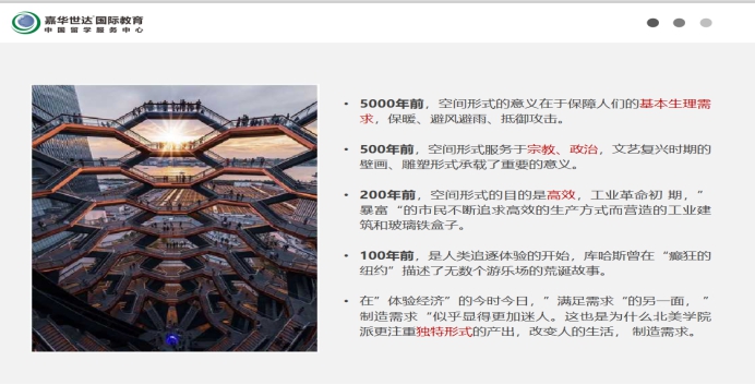 由于疫情的原因,虽然同学们还在家里远程上课,但是距离也阻挡不了大家学习热情和对出国留学的兴趣。一共有50余位同学通过微信社群参与了本次分享活动。宋老师给大家讲解了美国和英国地区建筑学相关专业的特点和课程设置,以及海外院校申请条件和要求,并且给大家梳理了大学期间留学准备的时间节点。帮助大家在疫情影响期间能够科学、系统性的去准备留学。陈鑫老师通过自己在海外的学习经验,以及自己之前在国际著名建筑设计事务所的工作经验,给大家分享海外建筑设计的最新理念、海外院校教学特点,以及一些优秀的海外建筑类申请作品集赏析。