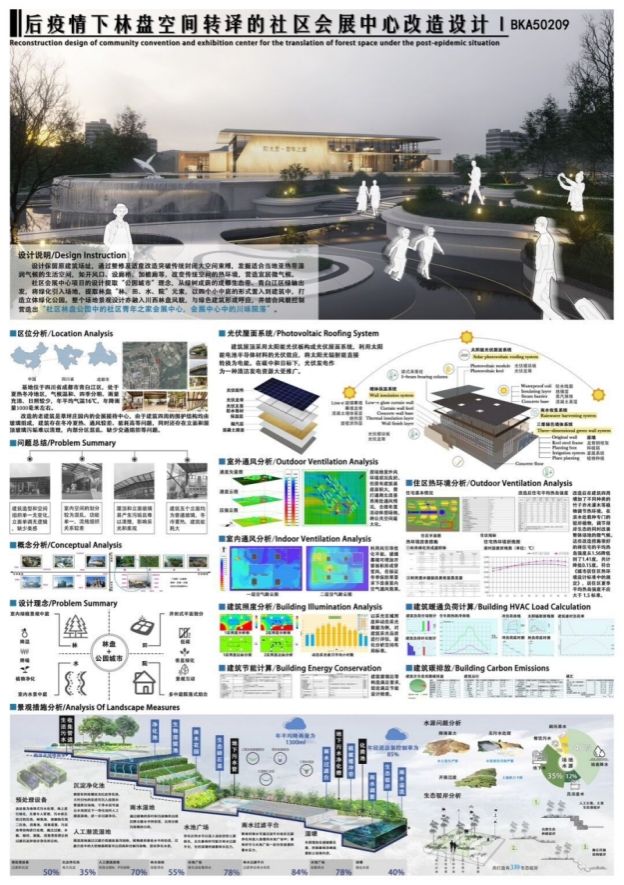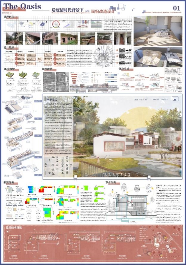 本次竞赛的主题是“低碳和后疫情背景下城市环境中的公共建筑(含校园建筑)”,两支参赛队伍在指导老师的带领下,积极展开调研和设计推敲,运用所学知识,探索未来城市绿色发展的新可能。黄李、何丽诗、钟晚秋、卓佩颖、尹正团队作品《TheOasis——后疫情时代背景下的民宿改造设计》通过改造废弃建筑为民宿,打造低碳低成本的城市“绿洲”以及缓解城市人群精神压力的精神“绿洲”,以预见性角度,将绿建技术与模块化设计结合,提供后疫情城市不确定性问题预案。补远、邹嘉琪、廖玉琳、雷桐、王宇航团队作品《后疫情下林盘空间转译的社区会展中心改造设计》提取林盘"林、田、水、宅"元素,以四个小中庭的形式置入建筑中。整个场地景观设计亦融入川西林盘风貌,与绿色建筑形成呼应,结合风貌控制营造出“林盘公园中的社区会展中心,会展中心中的川味院落”。