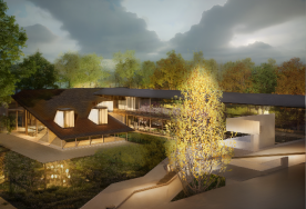 树荫深深,浮云悬横,与日月和光,携山峦同尘。设计以有机建筑为核心思想,根植于对生活、自然形态的情感,以乡土建筑为基而又破土于传统建筑形态,以光下脐橙树影为概念,使用弧形片墙作为构成元素,曲线的残缺与圆满让建筑更具有呼吸感与生命力,大成若缺,和光同尘,使其活在山川中。新旧融合,打造现代化和美乡村。